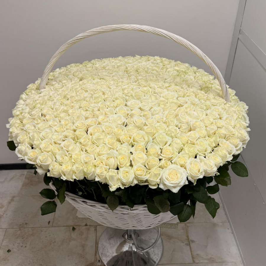 На фото букет из 501 белой розы в корзине «нежность». В составе: роза 501 шт, оазис флористический 7 шт, корзина (xl) 1 шт, . Все цветы свежие и ароматные, букет красиво оформлен и отлично подходит для подарка. Доступна доставка цветов или самовывоз.